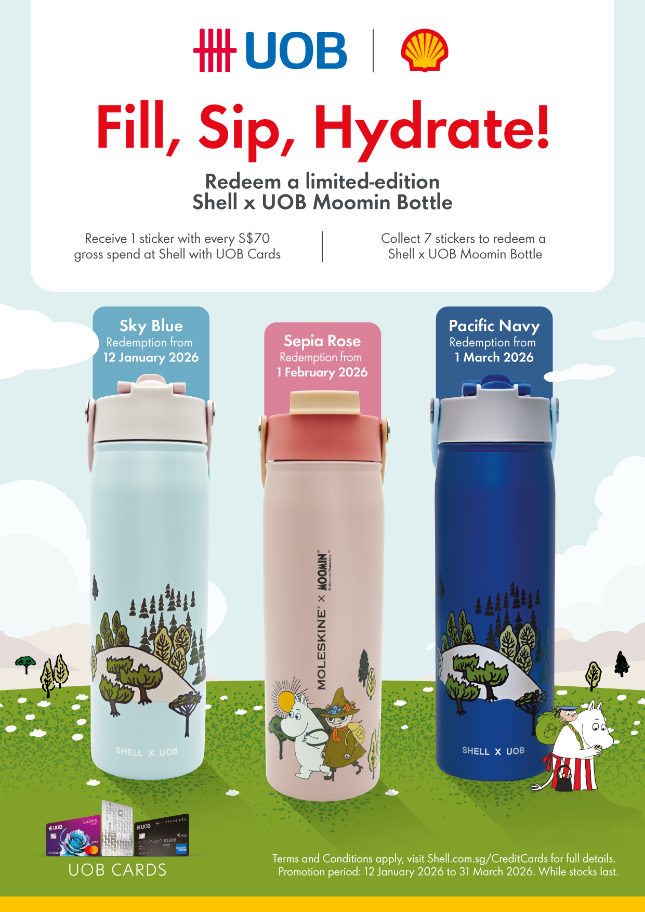 Beyond fuel, the Shell x UOB Moomin bottle promotion remains available until 31 March, while stocks last. Customers who spend S$70 at Shell with a UOB Card will receive one sticker, and can collect seven stickers to redeem a limited-edition Shell x UOB Moomin bottle, available in Sky Blue, Sepia Rose and Pacific Navy designs.