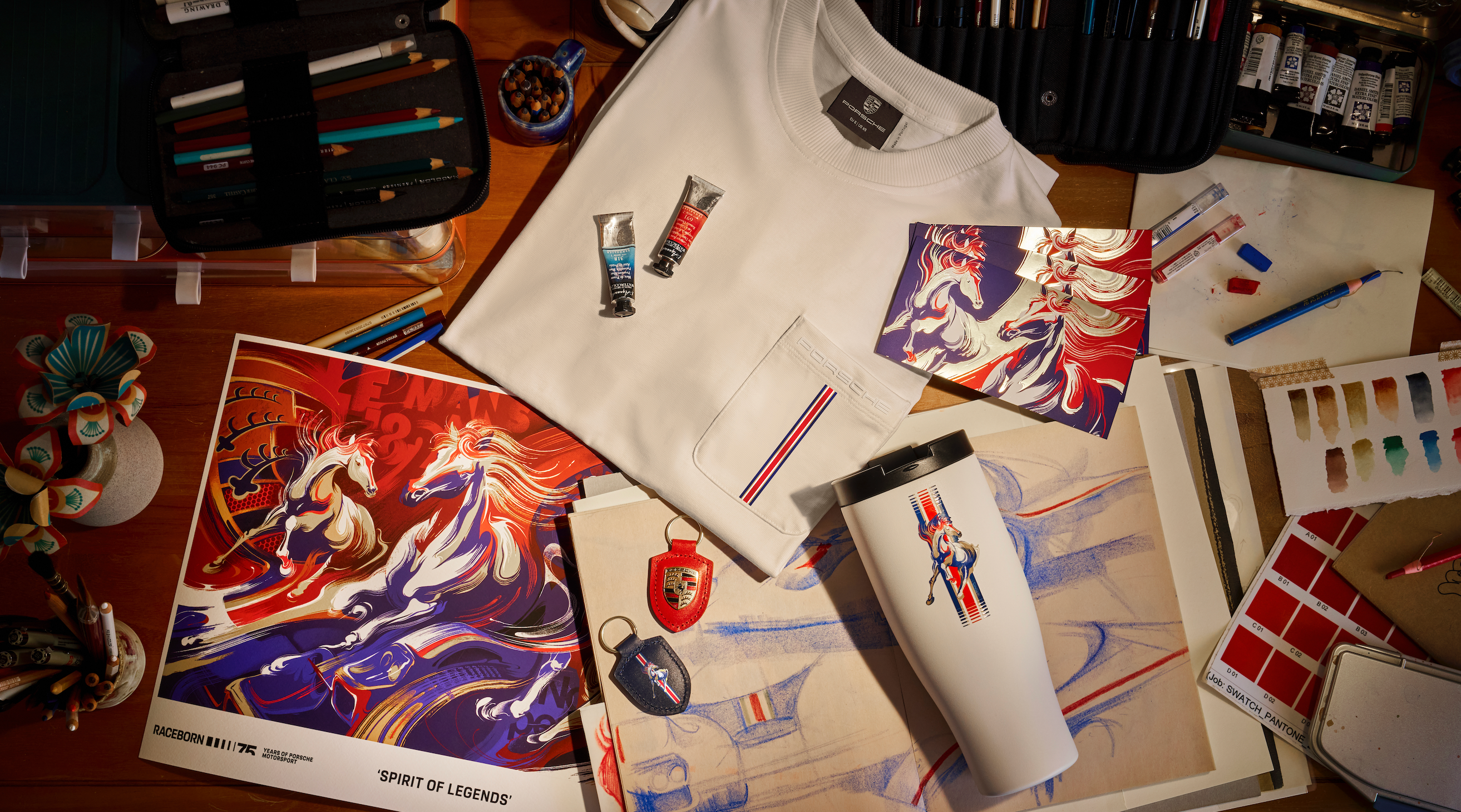 Limited-edition t-shirts, thermal mugs and keychains featuring artwork also for sale exclusively at Porsche at Jewel.