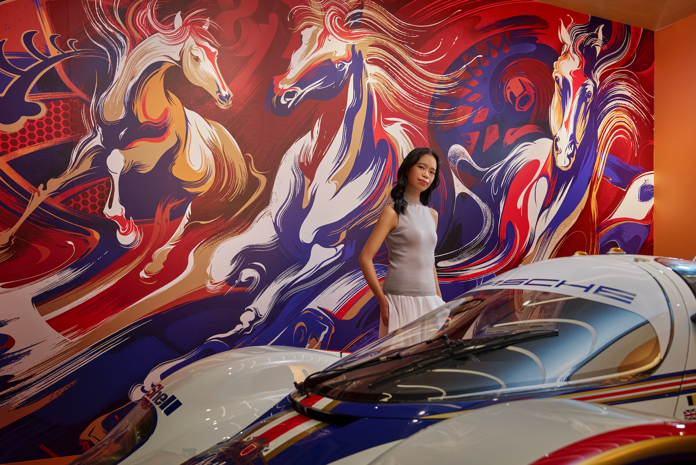 The mural brings together Tey’s distinctive, whimsical visual language with Porsche’s rich motorsport heritage. It also commemorates Porsche’s 75th anniversary in motorsport in 2026, tracing back to the brand’s first class victory at the 24 Hours of Le Mans in 1951 with the Porsche 356 “Super Leicht”. The work draws natural parallels with the Lunar Year of the Horse, using horses as its central motif to express ideas of power, agility, speed and forward motion - qualities deeply associated with Porsche. These forms also reference the iconic Porsche crest, which originates from the Stuttgart city seal.